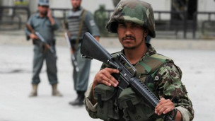 Tentara Afganistan terlihat berjag-jaga di lokasi bekas serangan bom bunuh diri di Kabul, Afganistan.