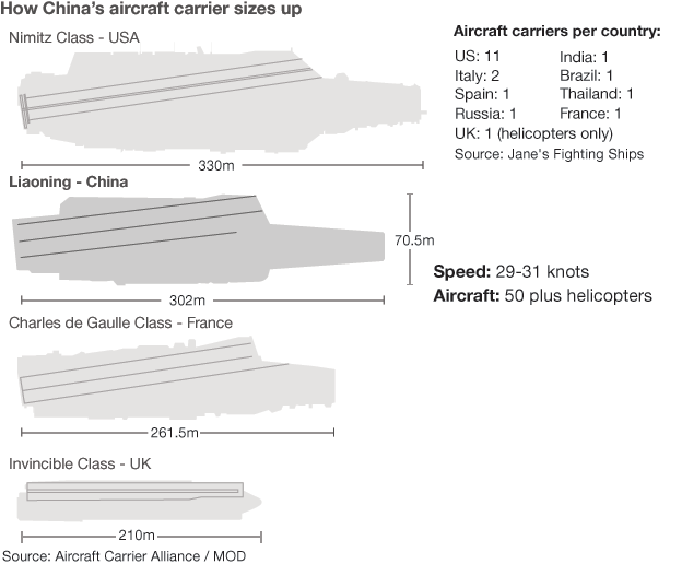 Kapal induk Liaoning diproduksi oleh Uni Soviet dan dibeli dari Ukraina. Cina kemudian menghabiskan waktu selama sekitar 10 tahun untuk meremajakan kapal yang sebelumnya tidak digunakan dan berkarat.