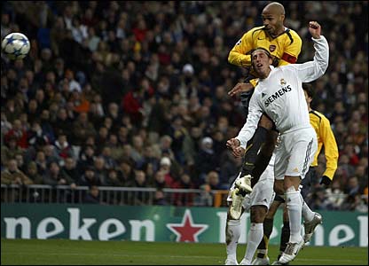 Thierry Henry melompat di belakang pemain Real Madrid, Ramos Sergio.