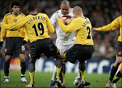 Ronaldo diblok oleh Gilberto dan Philippe Senderos di saat Real berusaha menciptakan peluang bagi timnya.