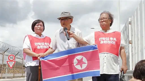 한국에서 42년 넘게 복역 후 출소해 최장기수 중 한 명으로 손꼽히는 안학섭 씨가 북한 인공기를 펼치고 판문점(공동경비구역)으로 가기 위한 길목인 통일대교를 찾았다. 올해 95세인 그는 "북한에서 묻히는 것"이 소원이다.