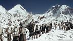 • Коштоочулар жана жардамчылар лагерге керектүү каражаттарды жеткирип турушкан. Сүрөттө оң жакта Лхо Ла ашуусу. Бул жерде жогору жактагы аскалардан улам-улам көчкү кулап турган.