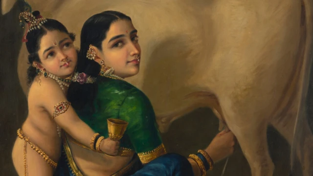 "रेशमी वस्त्रांची पोत, दागिन्यांची झळाळी, त्वचेची कोमलता आणि गायीची शांत स्थिरता यामुळे हे दृश्य भक्तिभावपूर्ण आणि जिव्हाळ्याचे वाटते," असे या चित्राचे वर्णन बंगळुरूस्थित रवी वर्मा हेरिटेज फाउंडेशननं एका पोस्टमध्ये केले आहे.