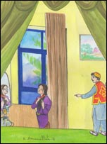 عابد په داسې حال کې چې په چورتونو کې ډوب ښکاري، کله د کړکۍ خواته ځي او خپل ځان دکړکۍ په ښېښو کې ويني او کله هم په هنداره کې ګوري؛ بيايو څو قدمه اخلي او له خپل ځان سره يوڅه وايي ته به وايي د کوم راز د موندلو په لټه کې دى. په همدې وخت کې يوناڅاپه جادويي تروم ورياديږي؛ په بيړه جادويي تروم را اخلي او پو کوي يې . لږه شېبه وروسته پرده دار اکا رارسيږي. تر روغبړوروسته عابد غواړي پرده دار اکا ته څه ووايي خو پرده دار په خندا ورته وايي چې هغه پوهيږي چې دکوم راز د موندلو له پاره يې راغوښتي، نو بې له ځنډه د پردې شعر وايي. داسرارو پرده يوې خواته کش کيږي. عابد دپردې تر شا خپله خور ،زهره ويني چې د هندارې تر مخ خپل ويښتان ږمنځوي. عابد حيرانيږي او له پرده دار اکا سره د پردې ترشا د زهرې ليدو ته ورځي. پرده دار دواړو ته وايي : ((آيا غوښتل مو چې د هندارې د جوړيدو په رازپوه شئ؟)) عابد په خوښۍ ورته وايي : (( هو، مخکې مې په ښېښه او هنداره دواړو کې ځان وليد اوددواړوپه توپير پوه شوم، خو په راز باندې يې پوه نه شوم.)) زهره د عابد د خبرو په دوام وايي : (( همدا څوشېبې دمخه مې د هندارې يوه ټوټه راواخيسته، کله مې چې د هغې شا وتوږله زموږ د کوردکړکۍ په څېر ساده ښېښه ترې جوړه شوه. ما نه شواى کولاى په هغې خپل ځان وګورم، خو په بله نيمه کې يې چې شا يې ژيړرنګ درلود زماڅېره سمه ښکاريدله ؛ پوه شوم چې هنداره اوښېښه دوه بيلابيل شيان دي. )) پرده دار تشريح ورکوي ، چې ښېښه او هنداره دواړه يوشى دى، هنداره هم له ښېښې جوړيږي. ماشومان حيرانتيا څرګندوي خو وروسته بيا له پرده دار اکا سره ټوکې او مسخرې کوي. زهره وايي چې په لږې خرابکارۍ سره په ډيراسان ډول له هندارې ښېښه جوړولاى شي، خو نپوهيږي چې له ښېښې څرنګه هنداره جوړيږي؟ پرده دار بيا هم جادويي کلمات وايي. په درنګ شېبه کې دديوال په کچه يوه غټه هنداره راڅرګنديږي. پرده دار له ماشومانو غواړي چې دهندارې شاته تيرشي، ماشومان سره له دې چې ويريږي هم، د هندارې شاته ځي.