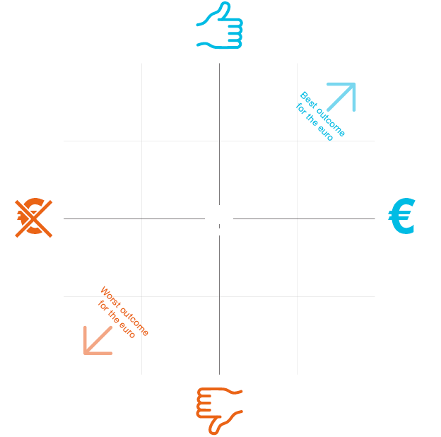 Click on the black circles to read more about each scenario. Moving from left to right goes from worse to better outcomes for the survival of the euro. Moving from top to bottom goes from not-so-bad to much much worse outcomes for Europe's economy. -