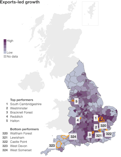 This map ranks each local authority district in England based upon their exports.The South East and London have the highest proportion of exporting businesses, supported by the strong transport networks within