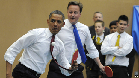 President Obama and Prime Minister David Cameron made a suprise visit to the Globe Academy in Lambeth, south London, where they teamed up for a game of table tennis against schoolboys.