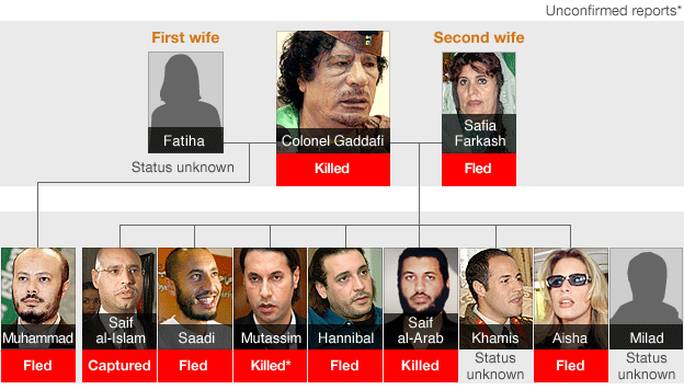 A look at the whereabouts, relationships and former roles of the family of ousted leader Colonel Muammar Gaddafi after his capture and death in his Libyan hometown of Sirte.