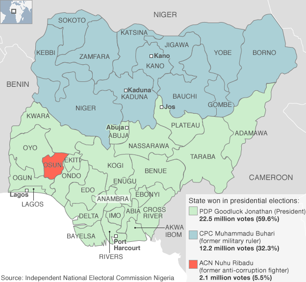 To win at the first round, a candidate not only needs the majority of votes cast, but at least 25% of the vote in two-thirds of Nigeria's 36 states. Goodluck Jonathan, of the PDP, reached that threshold in 31 states; runner-up Muhammadu Buhari of the CPC only did so in 16 states.