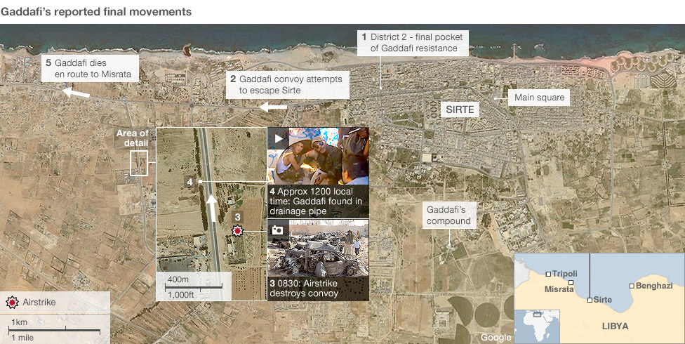 Among those in the convoy were Col Gaddafi's son Mutassim and head of the army Abu Bakr Younis Jabr. Both men were later reported dead at the scene and Mutassim's body shown on Libyan TV.