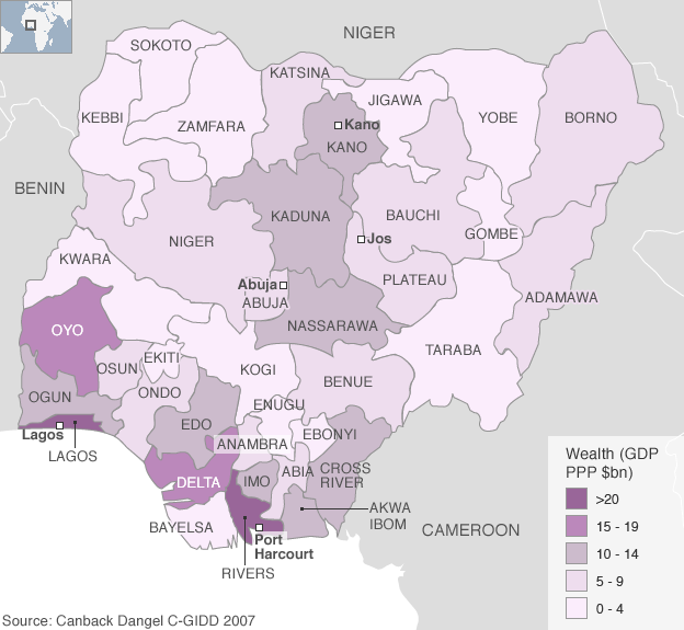 Nigeria is Africa's biggest oil producer and among the biggest in the world but most of its people subsist on less than $2 a day. The oil is produced in the south-east and some militant groups there want to keep a greater share of the wealth which comes from under their feet. Attacks by militants on oil installations led to a sharp fall in Nigeria's output during the last decade. But in 2010, a government amnesty led thousands of fighters to lay down their weapons.