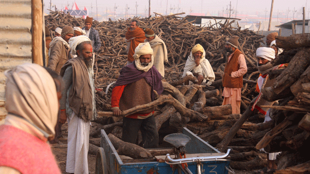 The temperature drops to 0C or 1C at night, so the Uttar Pradesh Forest Corporation provides firewood for pilgrims.