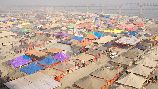 The "mega mela" takes place every 12 years at the confluence of the Ganges and the Yamuna rivers - and the mythical Saraswati. The mudflats of the delta are transformed into a tent city, with the thronging masses visible from space (as the above satellite image from a smaller Kumbh Mela in 2007 shows).
