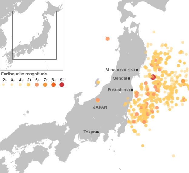 Press the play button or use the slider to see the spread, size and frequency of earthquakes in Japan greater than magnitude 5 since 10 March.