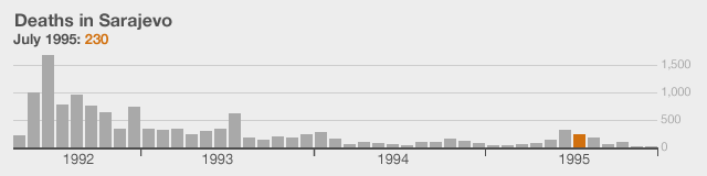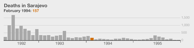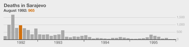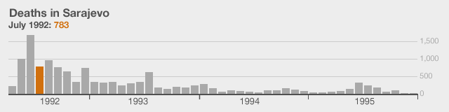 The data for the monthly death toll has come from the Istrazivacko Dokumentacioni Centar Sarajevo (research and documentation centre in Sarajevo). These figures have been produced after extensive research of local and international records and corroborated by other documentary evidence. You can find more details at their website.