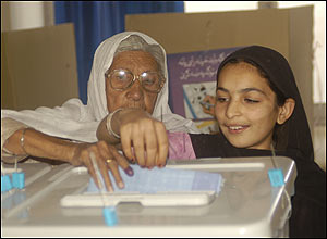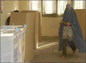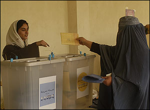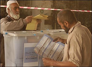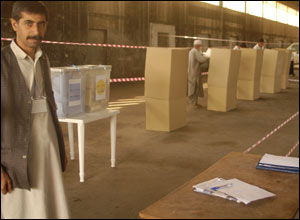| | کارمند ستاد انتخابات افغانستان، رای دهنده را راهنمايی می کند |