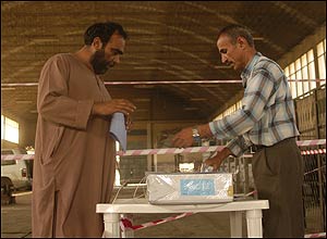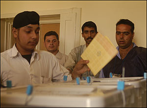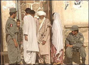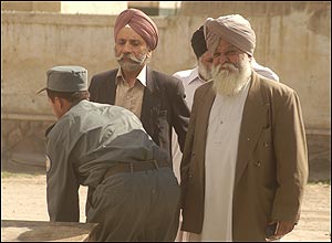 | | يک سرباز پليس کابل، رای دهندگان را که از اقليت سيک افغانستان هستند، پيش از ورود به محل رای دهی بازرسی می کند |