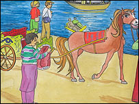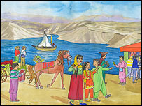 ناديه در حالی که به طرف خانه راه افتاده به حشمت برادرش بر می خورد که از بازارآمده است. ناديه تصويری را که پيدا کرده، با سوزنمايی به حشمت نشان می دهد. حشمت ازآب شفاف و رنگ آبی درياچه در آن عکس تعريف می کند و هر دو درهمين مورد غرق صحبتند که يک باره خاله گاديران با قد بلند بالا و خنده قهقه اش همراه با موزيک جادويی حضورمی يابد. اطفال ازديدن خاله گاديران اظهار خوشی می کنند و پست کارتی را که در مورد آن باهم حرف می زدنند به خاله گاديران نشان می دهند. خاله گاديران با ديدن پست کارت می گويد که اين تصوير بند امير، يکی از تفريحگاه های مشهوردر ولايت باميان و اضافه می کند که روزانه صدها تن اعم از داخلی وخارجی به ديدن اين بند می روند. اطفال با اصرار ازخاله گاديران تقاضا می کنند تا آنها را به تماشای بندامير ببرد. خاله گاديران می پذيرد و با گفتن کلمات جادويی "انگره بنگره دنگره چف"، اسب گادی با شيهه بلند و با تاخت نزديک شده با شدت تمام توقف می کند. بعد از سوار شدن اطفال و خاله گاديران درگادی، با گفتن کلمات "چم چم چين چو قمچين" گادی به سوی بند امير در ولايت باميان پرواز می کند. سرعت پرواز و صدای شمال (باد) ناديه، حشمت و خاله گاديران را وامی دارد تا با صدای بلند صحبت کنند. حين پرواز ناديه و حشمت از سرسبزی و آب شفاف بند و وسعت آن سخن می گويند و آن را زيباتر از تصوير قبلی می خوانند. رفته رفته (کم کم) گادی به مقصد نزديک می شود و خاله گاديران گوشزد می کند تا اطفال هنگام فرود آمدن گادی مواظب خودشان باشند، بعد هم گادی با گفتن "اللو پللو اللو پللو اللو پللو" نشست می کند.