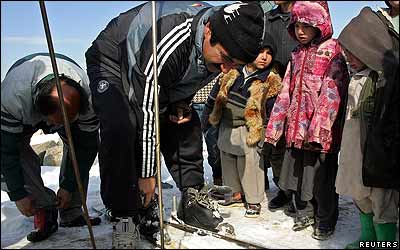 کودکان افغان که برای اولين بار شاهد اين بازی بودند، با شور و شادمانی به اسکی بازان نگاه می کردند.