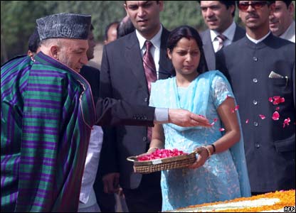 حامد کرزی رييس جمهور افغانستان، بر آرامگاه مهاتما گاندی رهبر ملی هند حضور يافت و بر مزارش گل پاشيد