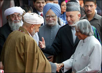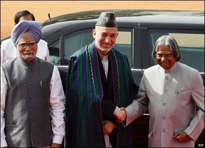 پرفسور زين العابدين عبدالکلام رييس جمهور (سمت راست) و منموهان سينگ نخست وزير هند، هنگام استقبال رسمی از حامد کرزی در کاخ رياست جمهوری
