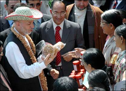 حامد کرزی در شهر حيدرآباد، از محصولات محلی مردم اين شهر جنوبی هند، در موسسه ملی انکشاف دهات بازديد می کند
