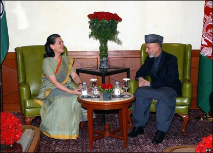 رييس جمهور افغانستان در ديدار با سونيا گاندی رهبر حزب کنگره هند و بيوه راجيو گاندی نخست وزير فقيد اين کشور.