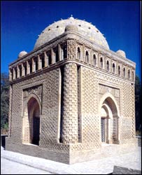 از اولين آثار معماری اسلامی مختص اين دوران، مسجد ماه خاصه در مجموعه چهار بکر بخارا و بخصوص مقبره امير منصور سامانی در بخارا، که به دستور شاه اسماعيل سامانی بنا شده بودند، به دليل ويژگیهای آنها جايگاه مهمی در معماری اين دوره دارند. مقبره امير منصور سامانی که قرنها زير خاک مدفون بود، در سال ۱۹۳۴ ميلادی توسط باستان شناسان روسی کشف شد. در بسياری از ساختمان ها با تالارهای بزرگ، نظير مساجد و سالنهای اجتماع از ويژگيهای فيزيکی گنبد برای سقف اين تالارها استفاده می شد. پلان دايره وار شکل معمول اين بناها بود. اما در ساخت مقبره سامانی برای اولين بار گنبد کروی بر روی يک پلان مربع شکل ساخته شد، که اين انقلابی در هنر معماری و تکنيک ساختمان سازی بود. معماران اين دوره به دليل حرام بودن مجسمه سازی در اسلام سعی بر اين داشتند که به شيوه سمبليک که پيچيدگی های خاص خود را داشت بناهای مذهبی خود را تزيين کنند.