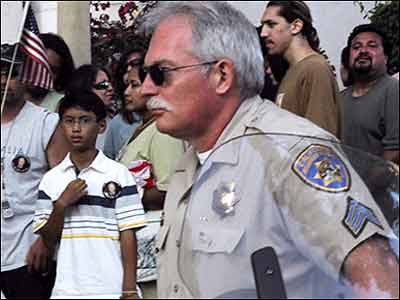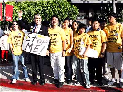 در حاشيه اين مراسم، يک جمع هفت - هشت نفری را ديدم که با لباس های يک رنگ زرد، در آنجا منتظر بودند. يک نفر ديگه هم ماسک George Bush رو به صورتش زده بود و پلاکارتی که رويش نوشته بود " Stop Me " ( جلوی من را بگيريد! ) هم در دست داشت.