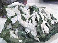 و بعد مجسمه زنی سپيدپوش را که کبوتری برسينه اش پرگشوده نشان می دهد و می گويد "پس از آن فريادها، اين آمد، با کبوترش." او با اشاره به دو کار سفالی پر از پرنده می گويد اينها دوستان کاوه در گورستان افجه اند. خانم گلستان برای ساختن اين آثار چهار ماه کار کرده است و در همان ساعت های اول نمايشگاه نزديک به نيمی از آنها به فروش رسيد. فخری گلستان بيست و چند سال مسئوليت اداره يک پرورشگاه پسران وابسته به دادگستری را به عهده داشته است. در سال ۶۲ او را از اين سمت برکنار کردند. و او که به سفال سازی علاقه مند بود، به سراغ سفال رفت. به قول خودش از راه تجربه اين کار را فراگرفت. از عوايد حاصل از اين نمايشگاه به نفع جايزه عکس کاوه گلستان استفاده خواهد شد. اين جايزه عصر شنبه يازده مهرماه در خانه هنرمندان به برگزيدگان اهدا خواهد شد. دو کار از مجموعه "دوستان کاوه در افجه"