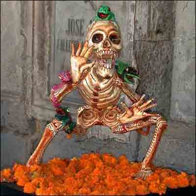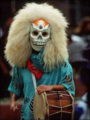 تو این جشن خودشونو به شکل اسکلت درست می کنن با لباسهای رنگی و گل و شمع و فشفشه، یک بزن و برقصی راه می ندازن که بیا و ببین . . . یکجور بالماسکه رنگارنگ راه می ندازن که خیلی دیدنیه. خوشبختانه یک رستوران مکزیکی تو لندن پیدا کردیم که این جشنو می گیره.