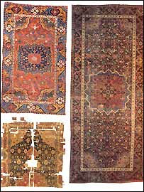 تکه های باقيمانده، بعضی از قالی های قديمی از بين رفته نيز به نمايش گذاشته شده که به همان اندازه که گرانبها و ديدنی است، حسرت بار و يا تاسف برانگيز هم هست.