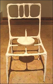 مجسمه سازی با استخوان کله حيوانی ( شايد گاو )، گاوی پر حرکت آفريده، ديگری با سنگی سفيد زيبای اندام زنی را بازآفرينی کرده و ... يکی از آثار به نمايش در آمده، صندلی سفيدی ساخته محمد رضا خلجی است که در سطح سوراخ سوراخش کاسه ای با ميخی بزرگ قرار دارد. صندلی طوری نور پردازی شده که با سايه اش معنا می يابد. بهروز اميری راد با استخوان کله حيوانی ( شايد گاو )، گاوی پر حرکت آفريده و ملک داديار گروسيان با سنگی سفيد زيبای اندام زنی را بازآفرينی کرده و