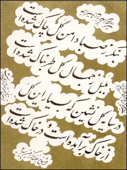بنگر ز صبا دامن گل چاک شده است بلبل ز جمال گل طربناک شده است در سايه گل نشين که بسيار اين گل از خاک برآمده است و در خاک شده است Look how the morning breeze has helped the rosebud bloom And how at the sight of the rose the nightingle swoons Come sit in the shade of the rosebush for such a rose Has often grown out of the soil to fall dawn again