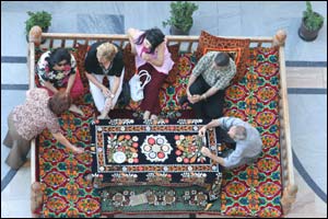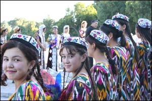 دختران اطلس پوش و چل گيس بافته سمرقندی در مراسم نثار گل به پای پيکره امير تيمور