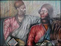 "این نقاشی رو از روی یک عکس قدیمی قمه زنی داشتم می کشیدم. این نقاشی همزمان شد با انهدام مجسمه های بودا بدست طالبان در بامیان. اینقدرمن متاثر شدم که جهت نقاشی رو عوض کردم. در بین قمه زنها، بتمن رو کشیدم که داره به دستیارش فکس می فرسته و می گه که دور مجسمه آزادی محافظ بزارن تا که اون رو منهدم نکنند ولی چند ماه بعد حادثه 11 سپتامبر اتفاق افتاد."