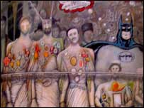 یکی از نقاشیهای حاجی زاده بتمن (مرد خفاشی ) را در کنار یک دسته سینه زنی نشون میده. در باره این نقاشی، حاجی زاده توضیح میده که: