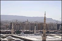 باز هم مثل مسجدالحرام، دور تا دور مسجد النبی را ساختمان های بلند گرفته است. قبلا مناره های پر نور مسجدالنبی از فاصله دور پيدا بود اما حالا زيبايی آن در ارتفاع ساختمان ها و هتل های اطراف گم شده است. درآمد ناشی از اسکان زائران در اين هتل ها و همچنين داد و ستدهايی که در اين مراکز تجاری صورت می گيرد، بيش از آن است که برای حفظ زيبايی محيط، بتوان از آن صرفنظر کرد.