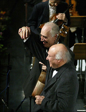 حسن ناهيد، نوازنده زن جايزه اش را از حسين صفار هرندی دريافت می کند