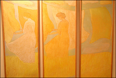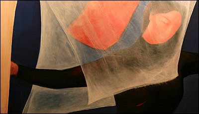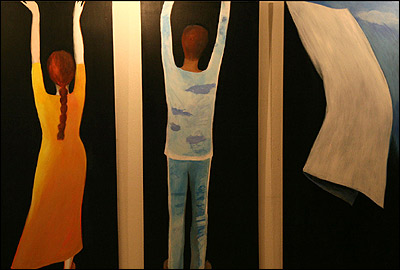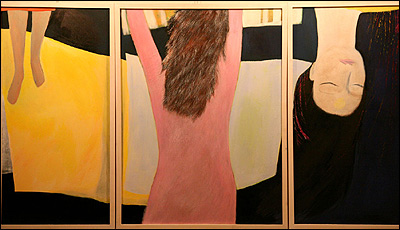 در این نمایشگاه چند اثر در قطع بزرگ و یک اثر سه لتی بزرگ به نمایش گذاشته شده است. بیشتر تابلوها نقش زن است و اکثر زن ها درحال آویزان کردن ملافه بر بند رخت اند.