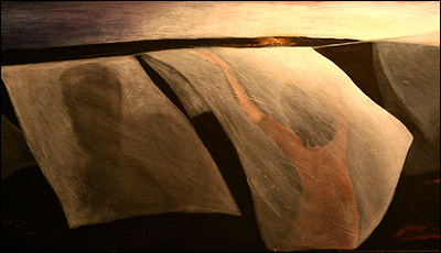 همگی گویا در فضا معلق اند و جایی بین زمین و هوا قراردارند و به نظر می رسد که آماده پرواز با بادبان ملافه ها هستند.