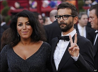 مرجان ساتراپی و ونسان پارونو سازندگان انیمیشن پرسپولیس از فرش قرمز عبور می کنند. ساتراپی تنها ایرانی نامزد اسکار هشتادم است.