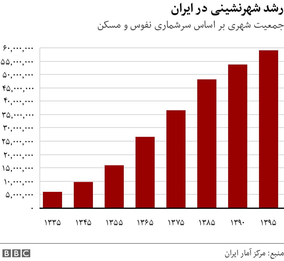 در حالی که در سال ۱۳۳۵ از هر سه ایرانی تنها یک نفرشان در یکی از شهرها سکونت داشت، امروزه از میان هر چهار ایرانی (و دیگر ساکنان ایران) سه نفر آنها در شهرها زندگی میکنند.