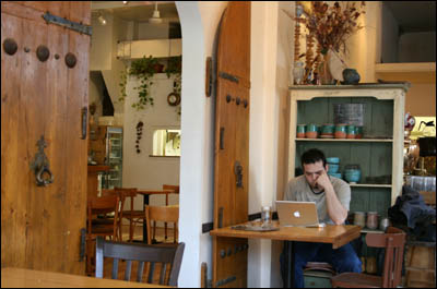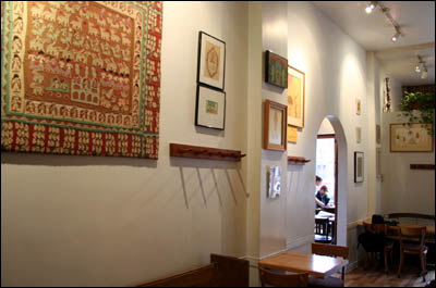 در کافه رستوران بيبلوس در مونترال به دليل خصلت قهوه خانه بودن مکان، معماری داخلی و دکوراسيون با استفاده کامل از عناصر قهوه خانه های سنتی طراحی شده است. سماور قديمی و استکان های کمر باريک و سينی های برنجی مخصوص چای و شيوه چای دادن (استکان کمر باريک قند پهلو روی سينی کوچک برنجی يا ظرف های ديزی) همگی از سنت قهوه خانه ای الگو برداری شده است. حتی چند تابلو قهوه خانه ای هم ديده می شود. در بخشی از رستوران هم می توان روی تخت هايی نشست که با فرش پوشيده شده است و به پشتی های ايرانی تکيه داد. در عين حال، گچکاری و کاشيکاری به سبک بناهای باستانی و يا عناصر آرايشی خانقاهی مثل تبرزين نيز به فضا اضافه شده است. در اينجا هم درهای چوبی معماری سنتی به کار گرفته شده است. عناصر آرايشی ديگر مثل تابلوهای نقاشی با فضاها و تم های ايرانی جابجا ديده می شوند.
