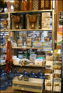بخش ديگری از آنچه در کنار صنايع دستی عرضه می شود محصولات صنايع سنتی ايران است که گرچه معمولا از شمار هنرهای دستی دانسته نمی شوند اما بيشتر کار دست اند يا در کارگاه کوچک ريخته گری توليد می شوند. اين وسايل از سيخ و منقل گرفته تا انواع وسايل سنتی آشپزخانه ايرانی را در بر می گيرد. اما بخش ويژه ای از سطح عالی صنايع دستی در کار استادان ظريفکاری ديده می شود که سازهای موسيقی می سازند. سازهای موسيقی بخش مهمی از هنر بومی ايران را نمايندگی می کند و بهترين آنها معمولا به نام استاد يا کارگاه سازنده آن شناخته می شود که هنری غيرقابل تقليد را عرضه می کنند. به اين معنا که برای ساخت يک ساز به شيوه ايرانی حتما بايد ايرانی بود و هنر ساخت را از استاد فراگرفت. اين موضوع در ساخت سازهای شرقی اصولا يک سنت مشترک است. توليد آنها غيرماشينی است و هنر ساخت آنها را بايد از طريق کار استاد شاگردی آموخت. بنابرين سازها در انتقال هويت يا در نشانه بودن موقعيت ممتازی دارند. بخش عمومی تر نشانه های موسيقايی ترانه های ايرانی است و نوار و سی دی های آن. شنيدن ترانه های ايرانی و عرضه نوارها و صفحه های موسيقی ايرانی بخش جدايی ناپذير هر فروشگاه ايرانی است. ديدن خوانندگان بر صفحه تلويزيون فروشگاه يا نماهنگ (ويديوکليپ) ها بر صفحه بزرگ نمايش در بعضی از رستورانهای ايرانی نيز بخش ديگری از فضاسازی ايرانی است.