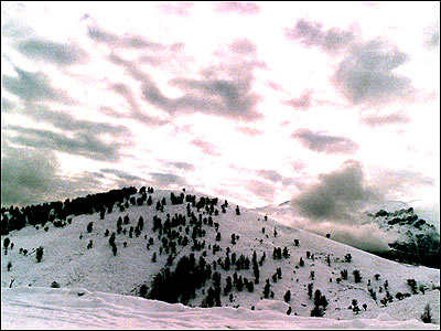 کوه در ميان دو سفيدی ابر و برف