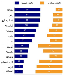 همچنین به ترتیب کانادا، ژاپن، اتحادیه اروپا و فرانسه در رده کشورهایی بودند که نقش آنها مثبت تر از سایر کشورها ارزیابی شده است. کشور هند ارتقا چشمگیری در نظرسنجی امسال نسبت به نظرسنجیهای گذشته داشته است و هم اکنون در رده کشورهایی مانند چین و بریتانیا قرار دارد. در نظرسنجی امسال جایگاه بریتانیا نیز نسبت به نظرسنجی سالهای گذشته افت کرده است. ارزیابی متفاوت از نقش ایران از میان 27 کشوری که این نظرسنجی در آنها انجام شده، مردم 21 کشور جایگاه ایران را منفی ارزیابی کرده اند. کشورهای اروپای غربی و آمریکای شمالی در میان کشورهایی بوده اند که بیشترین نگرانیها را درباره نقش منفی ایران ابراز کرده اند. ارزیابی منفی از نقش ایران در میان شرکت کنندگان در این نظر سنجی در آمریکا از 81 درصد به 63 درصد نسبت به نظرسنجی سال گذشته کاهش پیدا کرده است و در عوض در فرانسه، نیجیریه، کنیا و شیلی، ارزیابی منفی از نقش ایران با افزایش همراه بوده است. اما جايگاه ايران از نظر شرکت کنندگان کشورهای مسلمان در این نظرسنجی مانند مصر، اندونزی و امارات متحده عربی، بهبود چشمگیری داشته است. مويد نظرسنجی قبلی در ماه ژانویه امسال، سرویس جهانی بی بی سی نتایج یک نظر سنجی را منتشر کرد که از نگاه منفی اکثر مردم جهان نسبت به نقش ایالات متحده آمریکا درعرصه بین المللی حکایت می کرد. بر اساس آن نظر سنجی، شمار منتقدان آمریکا نسبت به دو سال پیش از آن به نحو قابل ملاحظه ای افزایش یافته بود. به گفته نيک چايلدز خبرنگار بی بی سی، نتایج نظرسنجی جدید نیز که تقریبا ً بر روی همان جامعه آماری اجرا شده، یافته های قبلی را تائید می کند. نگرش منفی نسبت به کره شمالی نیز کمی از آمریکا کمتر است. اسرائیل البته از دیرباز واکنشهای تندی را در جامعه جهانی برانگیخته است و سال گذشته در یک جنگ جنجالی در لبنان درگیر شد. ایران و کره شمالی هر دو به خاطر برنامه های هسته ای شان در کانون اختلافات بین المللی بوده اند. به گفته خبرنگار ما نگرش مثبت به کانادا، ژاپن و اتحادیه اروپا در این نظر سنجی می تواند ناشی از نقش نه چندان فعال این کشورها در منازعات اخیر بین المللی باشد. نيک چايلدز می گويد افکار عمومی در مجموع بر همان خطوط گسل متعارف سیاست جهانی تقسیم شده است. منفی ترین نگاه ها نسبت به اسرائیل به منطقه خاور میانه و همچنین اروپا مربوط می شود. طرز نگرش ها نسبت به ژاپن بجز در چین و کره شمالی عموما ً مثبت است. به نحو مشابهی اتحادیه اروپا نیز در مجموع امتیاز مثبت گرفته بجز در ترکیه و همچنین بخشهايی از خاور میانه. نظر شما درباره این نظرسنجی چیست؟ آیا نتایج آن مورد قبول شما است؟ نظرات خود را می توانید از طریق پنجره روبرو در بالای صفحه برای ما بفرستید. اگر اين نظر سنجی جواب واقعی سئوال از افکار عمومی مردم جهان باشد، در مورد پائين بودن رتبه ايران، اين عدم اعتماد محصول پشتکار رسانه های پر قدرت و پر نفوذ غربی در ايجاد اين بی اعتمادی است. عليرضا - تورتنو اين نظرسنجی را پيشتر در سايت خبرگزاری "ايلنا" خواندم. تقريبا هيچ تغييری نکرده بود. اين مدل نظرسنجی ها با جامعه آماری و سوژه های متفاوت بسيار ارزشمند خواهد بود و اسباب تحليل ها بسياری را فراهم خواهد کرد. اين رتبه ها از جنبه های بسياری در سياست و روابط بين الملل قابل بررسی خواهد بود. لطفا جزئيات بيشتر را به همراه نمونه های فراوان يا دلايل محبوبيت منتشر کنيد. بامداد - تهران به نظر ايران از همه کشورهای دنيا در نزد جهانيان و حتی خود ايرانيان منفورتر است که از اصلی ترين علل آن ميتوان به اظهارات اخير سران دولت از جمله آقای احمدی نژاد اشاره کرد. افزايش فقر و پايمال شدن حقوق بشر در ايران و افزايش ترس جهانيان از فعاليت های هسته ای مشکوک از ديگر علل هستند. آقای احمدی نژاد بايد بداند راههای شفافتر و ارزانتر و ضروری تری نسبت به انرژی اتمی مانند ايجاد پالايشگاه برای توليد انرژی وجود دارد که کمتر باعث حساسيت جهانيان ميشود. ضمنا غنی سازی اورانيوم که ۶۰ ۷۰ س