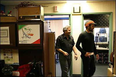 من با بهرام (وسط) و نيما ( چپ) رفتيم اتاق پخش زنده و کمی درد دل راديويی کرديم و نيما در عين حال داشت يکسری آگهی و موسيقی رو روی کامپيوتر انتخاب می کرد که به ترتيب پخش بشه. اينجوری راديو، به طور خودکار، تا صبح کار می کنه و صداش به خونه های ايرانيان و اتوميبلهاشون می رسه. همراه آگهی هايی که گفتارش شبيه صدای جملات روانپزشکه که داره آدم رو هيپنوتيزم می کنه! يک خانواده و يک راديو