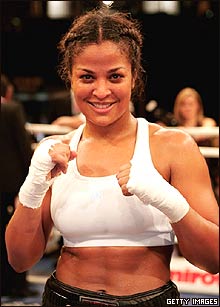 ليلا علی دختر مشتزن سنگين وزن سابق جهان محمدعلی کلی قبل از مسابقه با آسا ماريا ساندل در رقابتهای ميان وزن زنان در سالن مکس اشملين در برلين. پدر او محمدعلی کلی، روز شنبه به دليل همکاری با جنبش حقوق مدنی آمريکا، نشان صلح 'اوتو هان' را در برلين دريافت کرد.