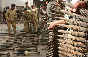 سربازان عراقی در حال چيدن تسليحات در مرکز پليس نجف: اين سلاح ها در ۷۰ کيلومتری نجف در بيابان توسط پليس عراق پيدا شد.